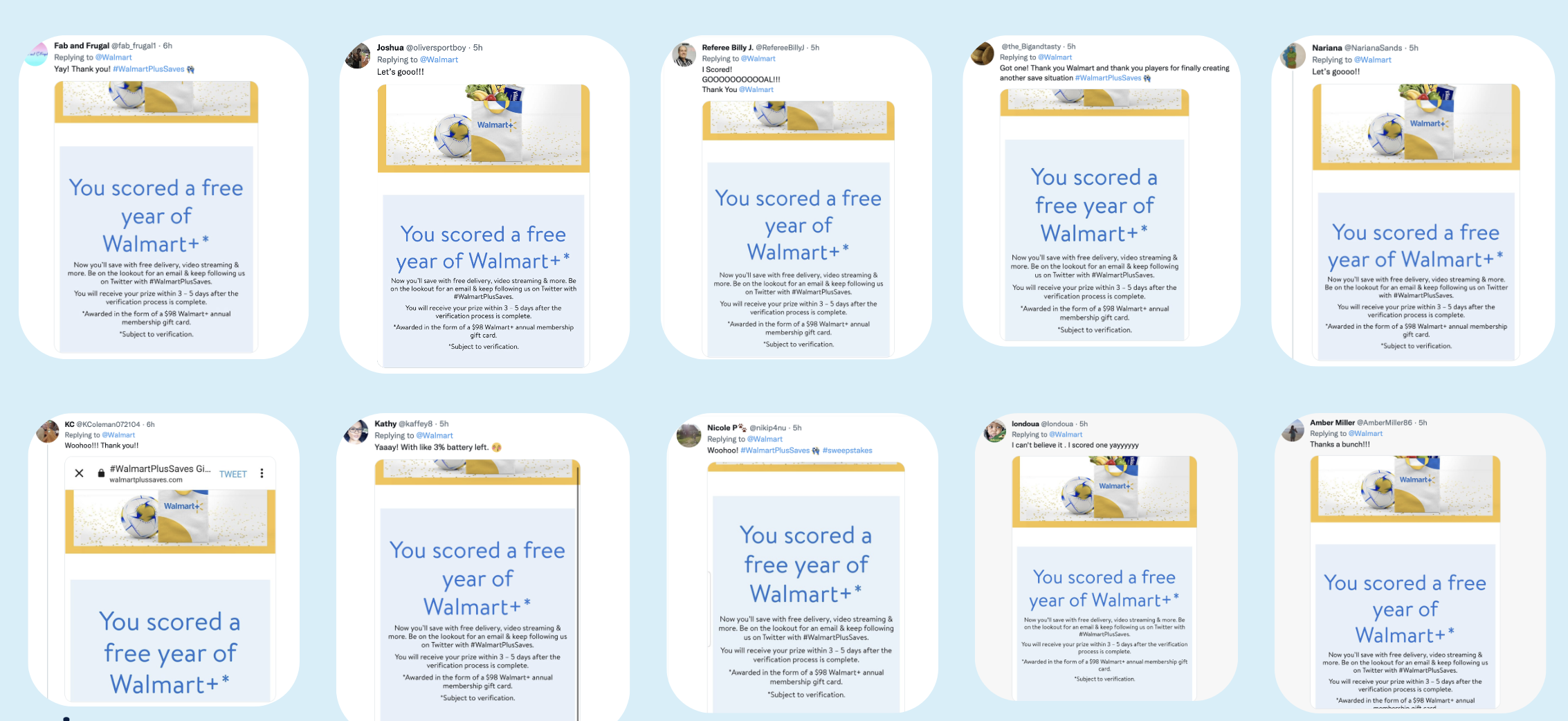 Every time a goalie made a save, Walmart tweeted out a microsite link for 100 people to win a free W+ membership. The brand also played into unplanned real-time moments and engaged directly with people on Twitter during the two matches.